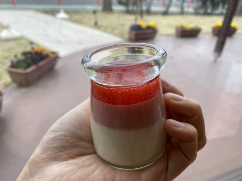 酸味のある苺のソースがクリーミーな苺プリンとミルクプリンで混ざり合います。